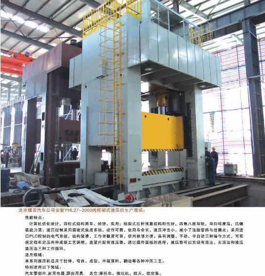 公司能够为市场提供42大类500余个品种的标准液压机和非标专用、精密伺服液压机。产品广泛应用于汽车、航天、粉末冶金、船舶、轻工、建筑、电子、家用电器等行业,并代表着我国通用液压机的发展水平。公司生产、设计、开发的液压机产品完全能够满足国内不同用户多层次的需要。